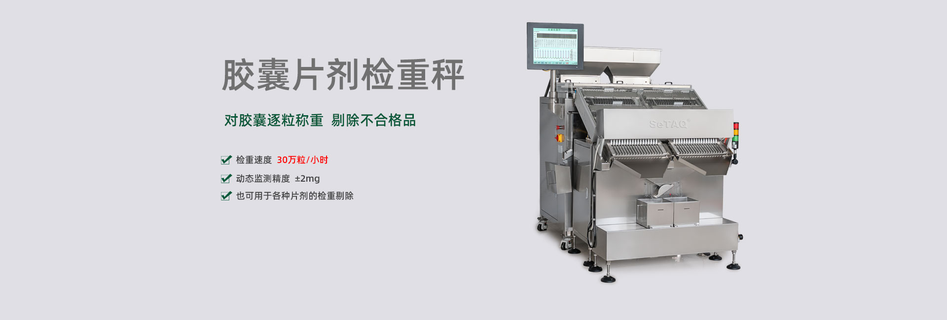 擁有近百項(xiàng)檢重專利和專有技術(shù),開發(fā)的產(chǎn)品可高速、高精度地檢測膠囊、片劑、丸劑、軟袋、軟管、紙盒、藥瓶、紙箱、薄片及各種器械、零件的重量偏差或缺件